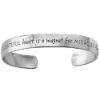 Wear what's in your heart on your wrist with a cuff bracelet inscribed with a meaningful sentiment. This hammered finish silver cuff bracelet is etched with the message “A GRATEFUL heart is a magnet for MIRACLES” and is accented with etched swirl designs and Swarovski crystals. The hidden message etched inside the cuff reminds us to always be “GRATEFUL”.