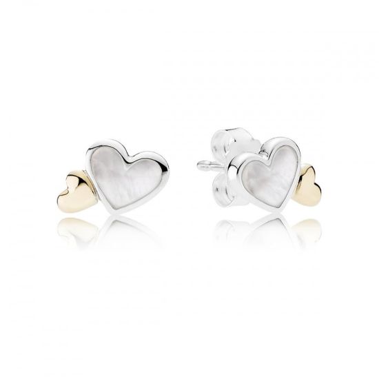 Captivating hand-finished stud earrings in sterling silver, adorned with sweet hearts in luxurious 14ct gold and lustrous mother of pearl.